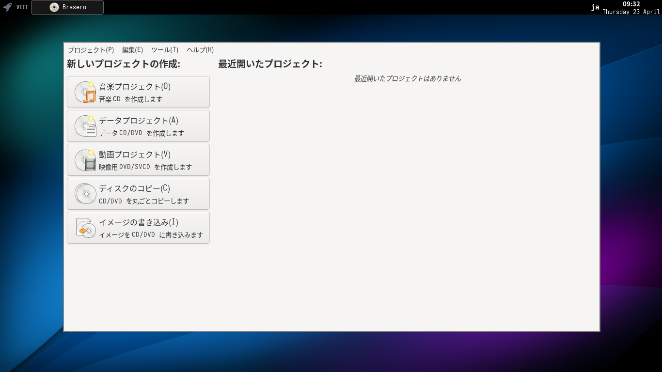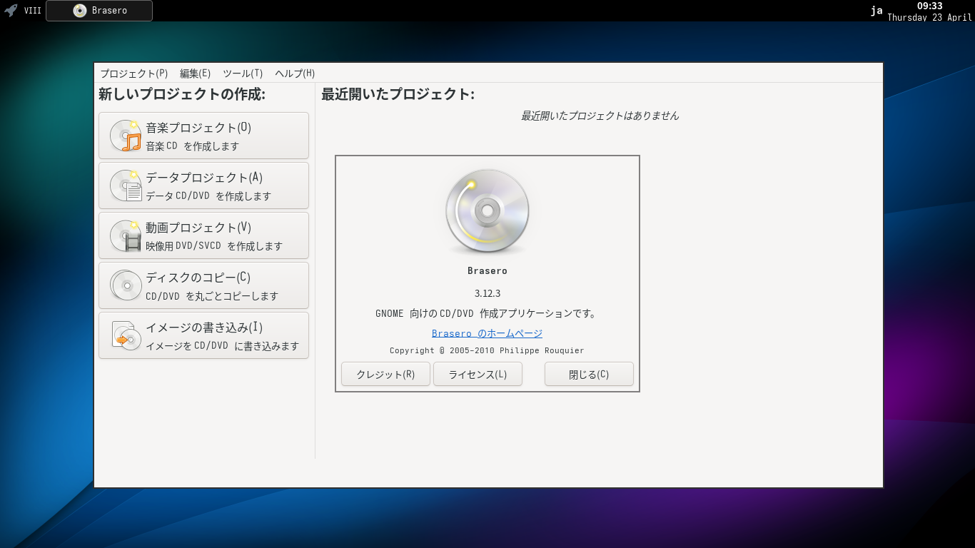 1. 概要 光ディスクライティングソフトとして、「Brasero」を使用します。 2. インストール 「root」ユーザ権限で。 apk add brasero brasero-lang 3. 起動 「スタート」→「サウンド&ビデオ」→「Brasero」