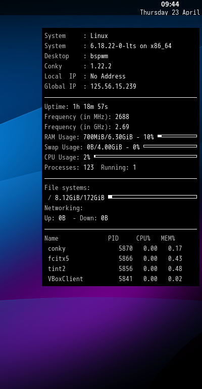 「システム情報」「ディストリビューション」「デスクトップ」「Conky バージョン情報」「IP アドレス」を複数行で表示します。