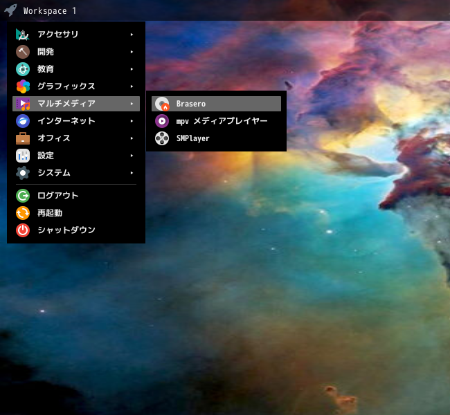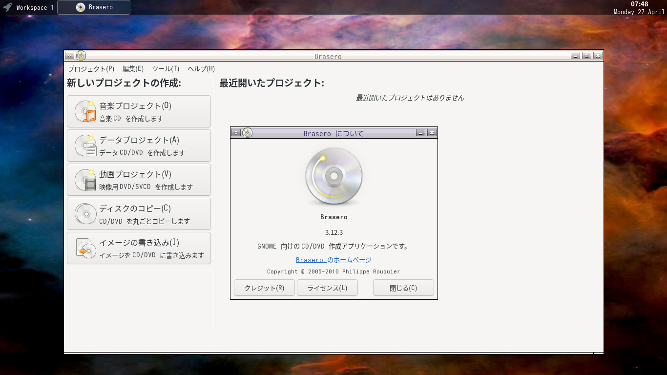 1. 概要 光ディスクライティングソフトとして、「Brasero」を使用します。 2. インストール 「root」ユーザ権限で。 apk add brasero brasero-lang 3. 起動 「スタート」→「マルチメディア」→「Brasero」