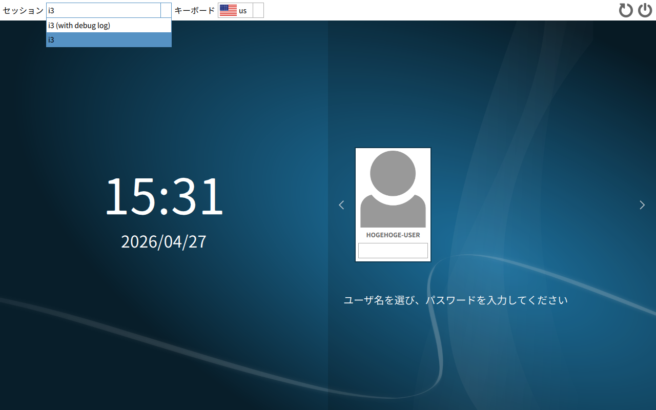 ログインの選択肢に、「i3(with debug log)」「i3」がありますが、「i3」の方でログインします。