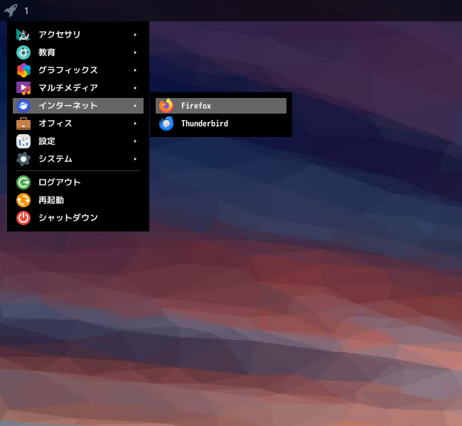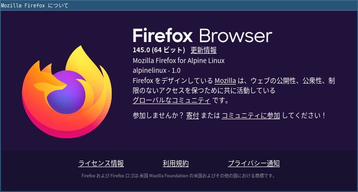 1. 概要 ブラウザとして、「Firefox」を使用します。 2. インストール 「root」ユーザ権限で。 apk add firefox 3. 起動 「スタート」→「インターネット」→「Firefox」