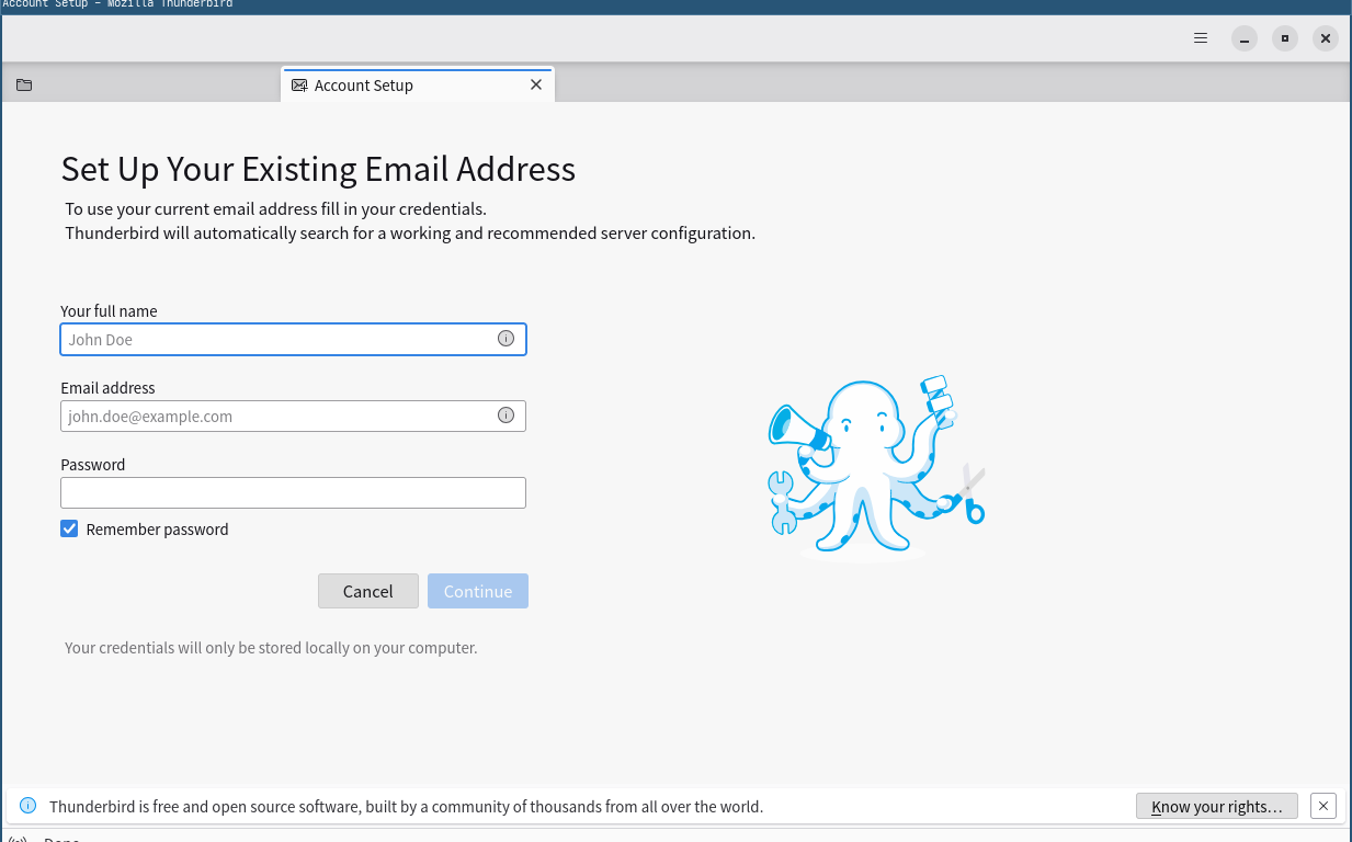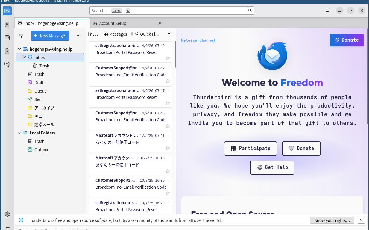 初回起動時は、「アカウント設定」が起動します。 起動直後に、受信ボックスを開いた状態です。 2026年4月28日の時点で、下記のバージョンでした。 「アカウント設定」「日本語化」他、操作方法等は「メール クライアント ソフト - Thunderbird」をご参照ください。 |