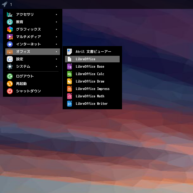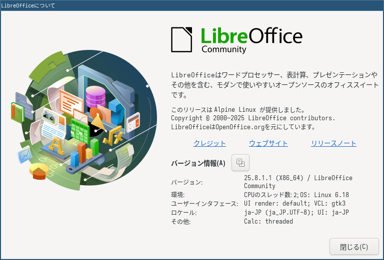 1. 概要 オフィススイートとして、「LibreOffice」を使用します。 2. インストール 「root」ユーザ権限で。 apk add libreoffice libreoffice-lang-ja 3. 起動 「スタート」→「オフィス」→「LibreOffice」