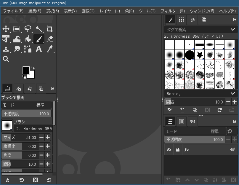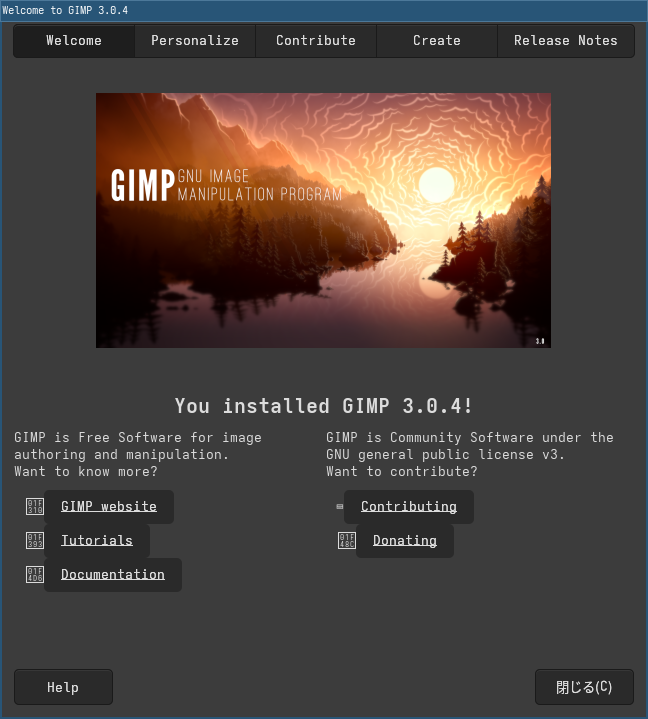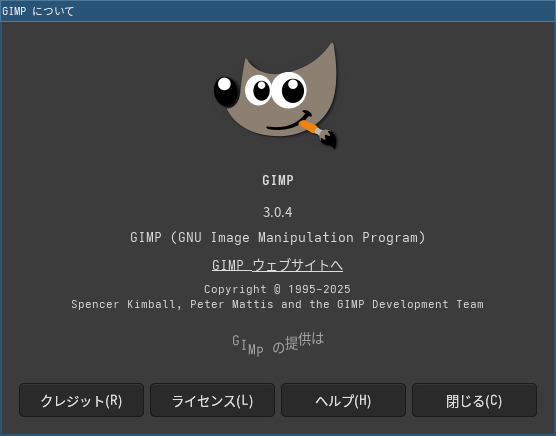 「閉じる」 起動直後の状態です。 2026年4月28日の時点で、下記のバージョンでした。 操作については、「画像編集ソフト - GIMP」に掲載しています。 上記は簡単なものですので、詳細なものがほしい方は、各所に初歩の手引きから応用編までありますので、そちらを参考にしてください。 |