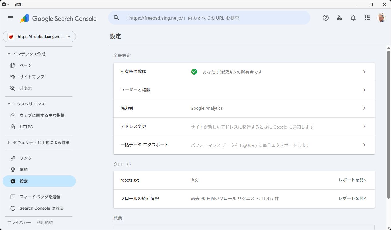 1. 概要 前ページで作成した「Google Cloud Console」のアカウントを「Google Search Console」で有効化します。 2. 有効化 「Google Search Console」へログインして。 「設定」→「ユーザと権限」