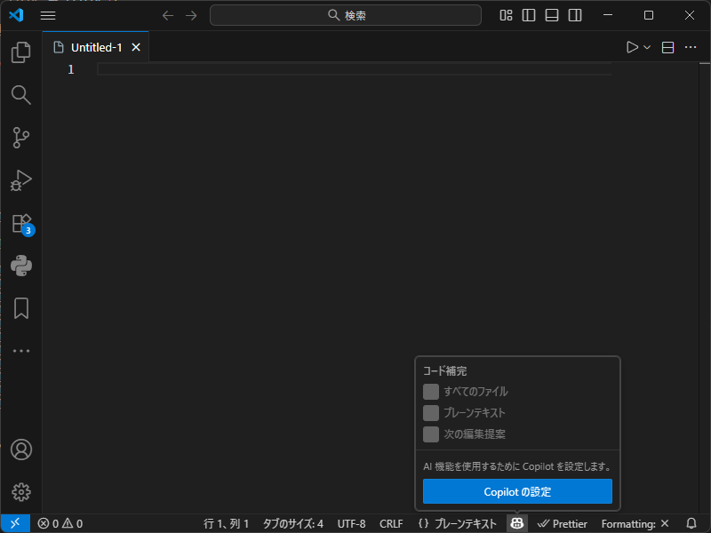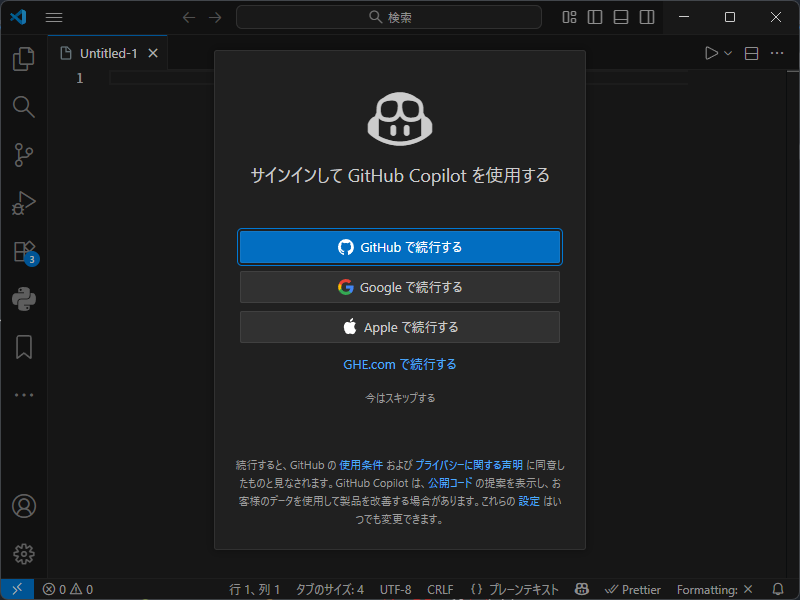 「Visual Studio Code」で「Copilot」が有効化されたように見えます。