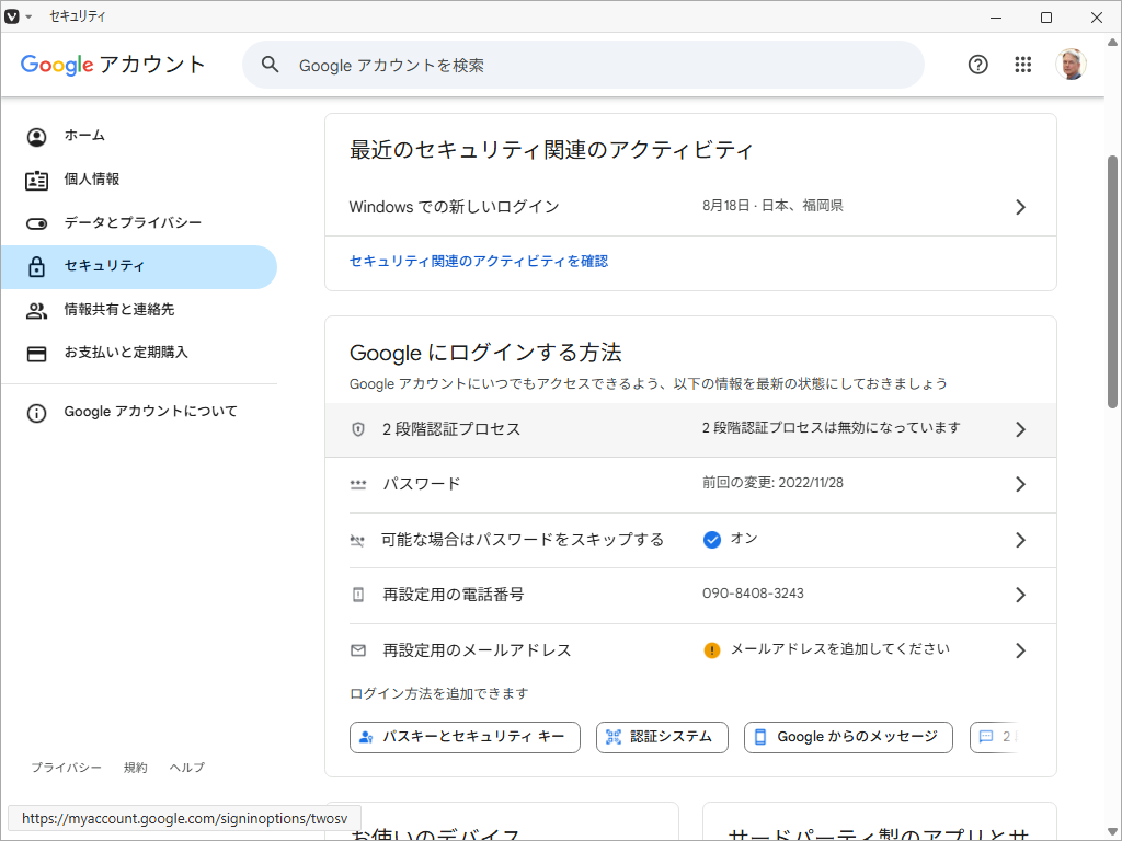 「Google」大先生は、公式にも二段階認証を設定するようにいっておりますので、二段階認証を有効にします。