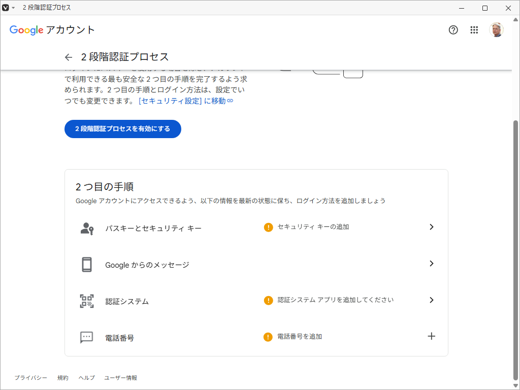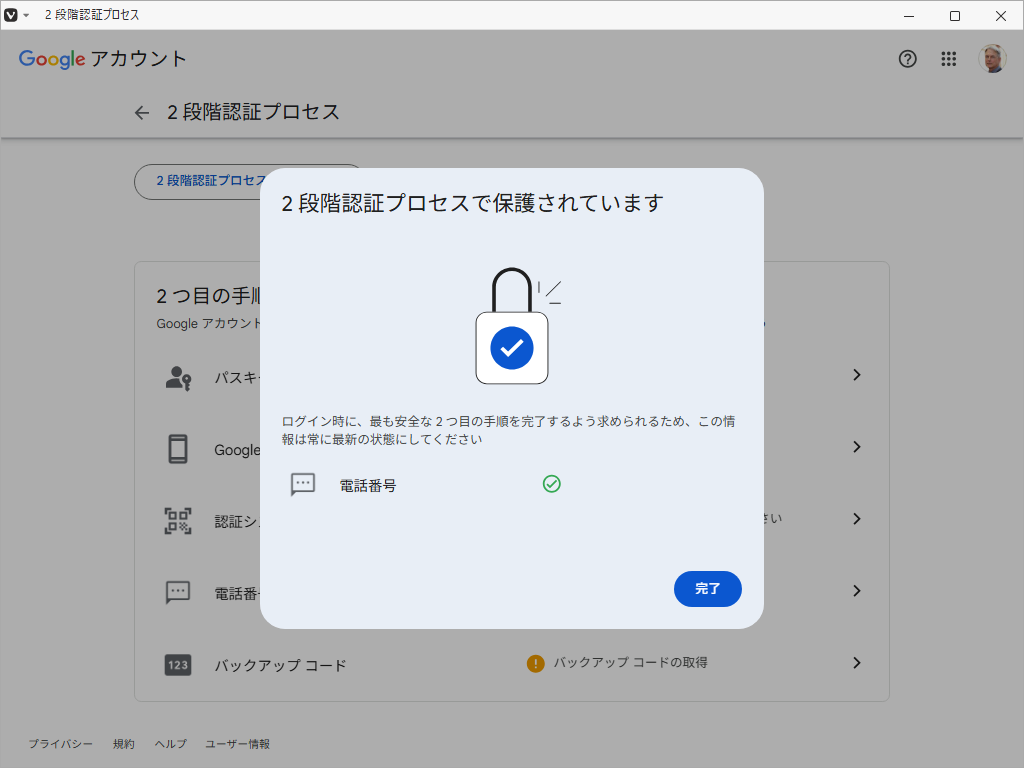 とりあえずは、電話で二段階認証プロセスを設定できました。
