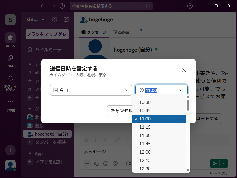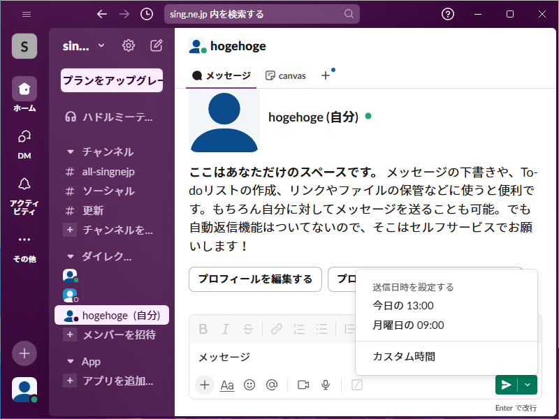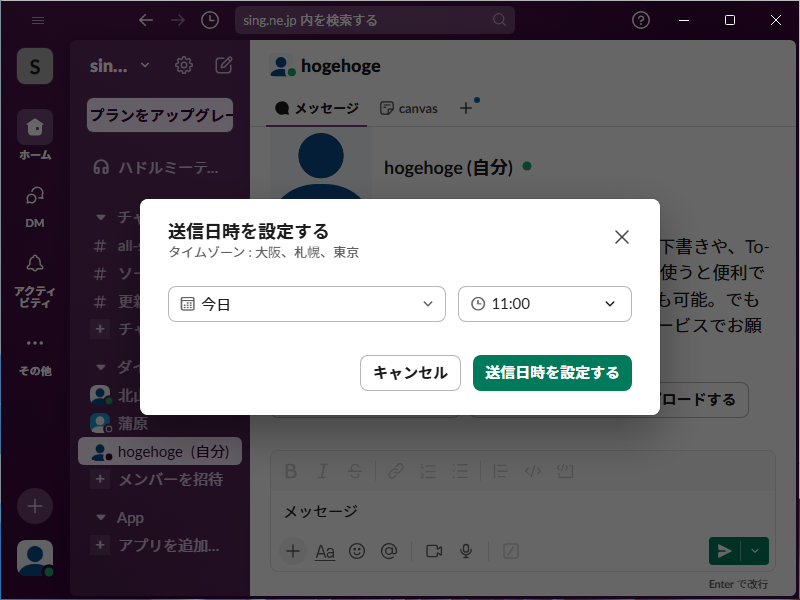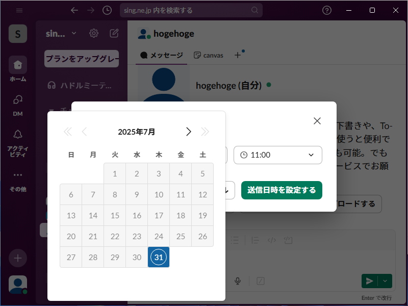 1. 概要 「slack」では、メッセージ送信時に、送信する日時を指定することができます。 日曜日に仕事で思いついたことを、誰かに送信する際、日曜日に送るのは気が引けます。 月曜日に届くようにしたいものです。 2. 指定 メッセージ送信で、右下の紙飛行機アイコン「」右の下向きアイコン「」