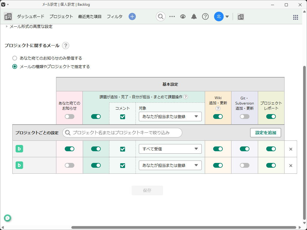 やたらチェックをいれたうえ、「すべて受信」を設定しておけば、そのプロジェクトに対して何らかの更新が発生する都度、メール受信することになります。