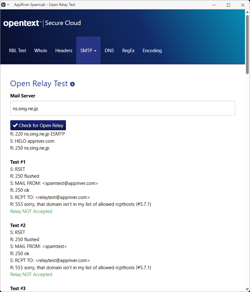 結果が、すべて緑色の「Relay NOT Accepted」であれば、なんら問題ありません。