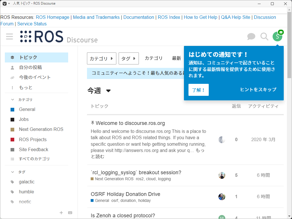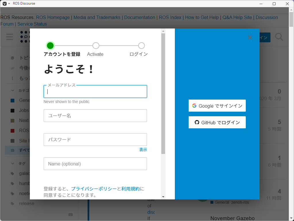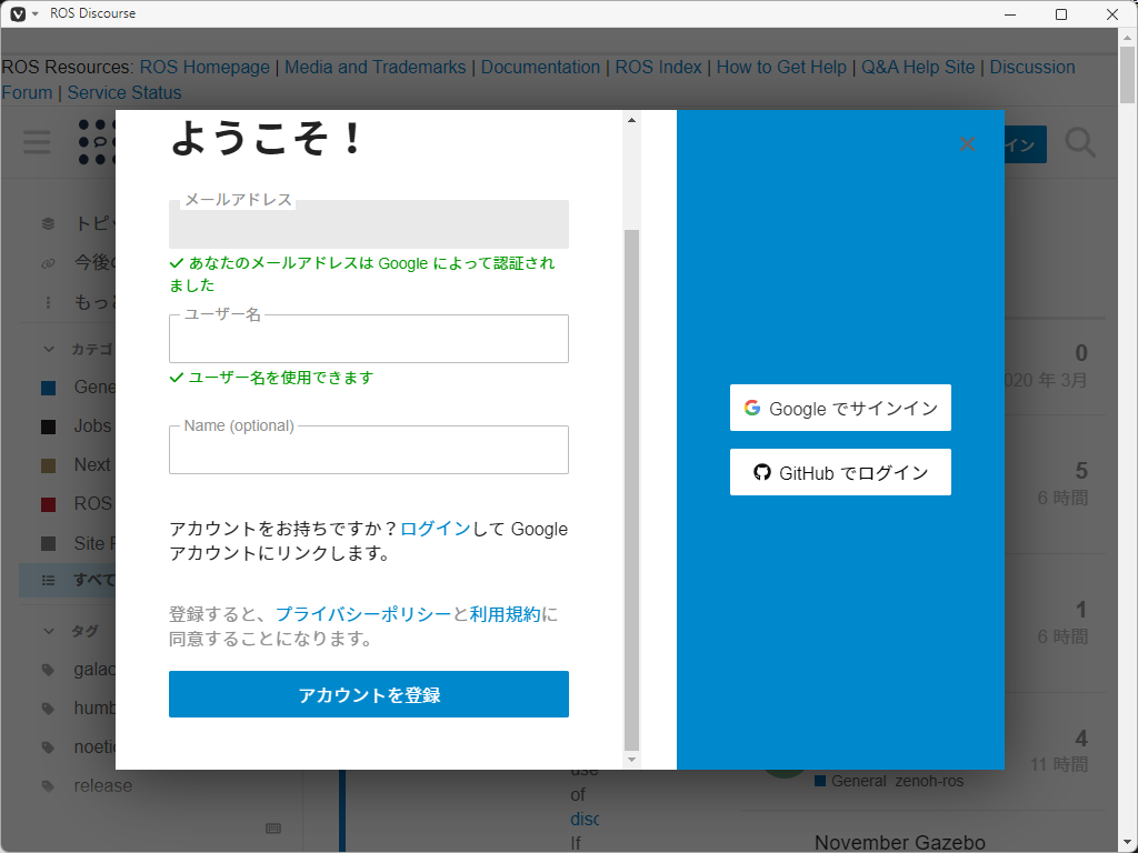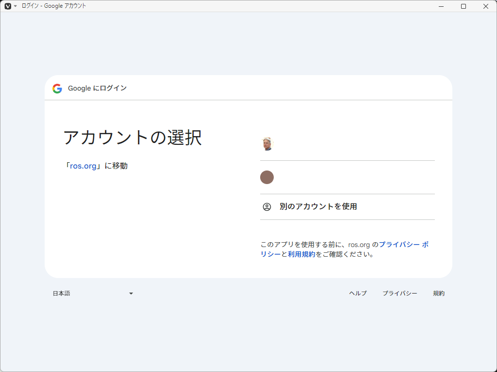 なんだ、「Google」大先生ところのアカウントが使えるんだ。 増えすぎて、パスワードが管理できなくなっちゃうものね。 「Google」でサインイン。 「ROS」に使用するアカウントを選択します。 「次へ」 「アカウントを登録」 「了解」 これで、アカウント登録できたようです。 |
