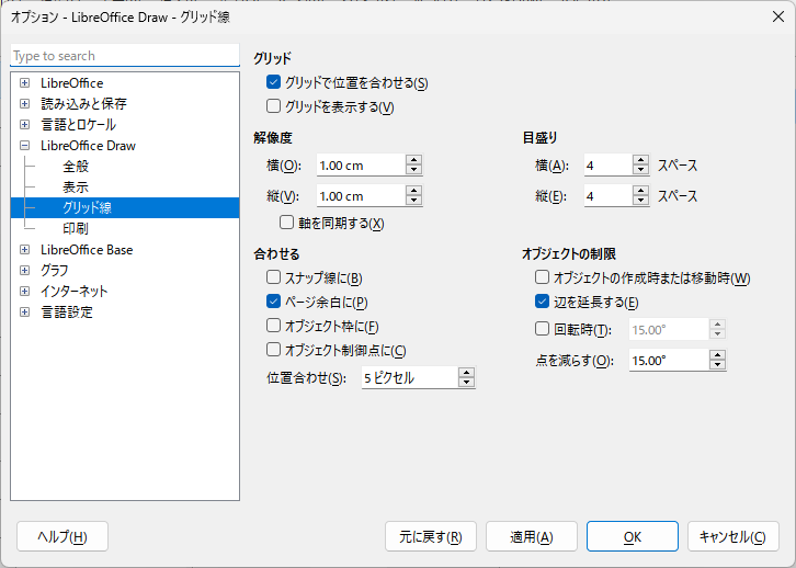 「LibreOffice Draw」「グリッド線」タブで設定します。
