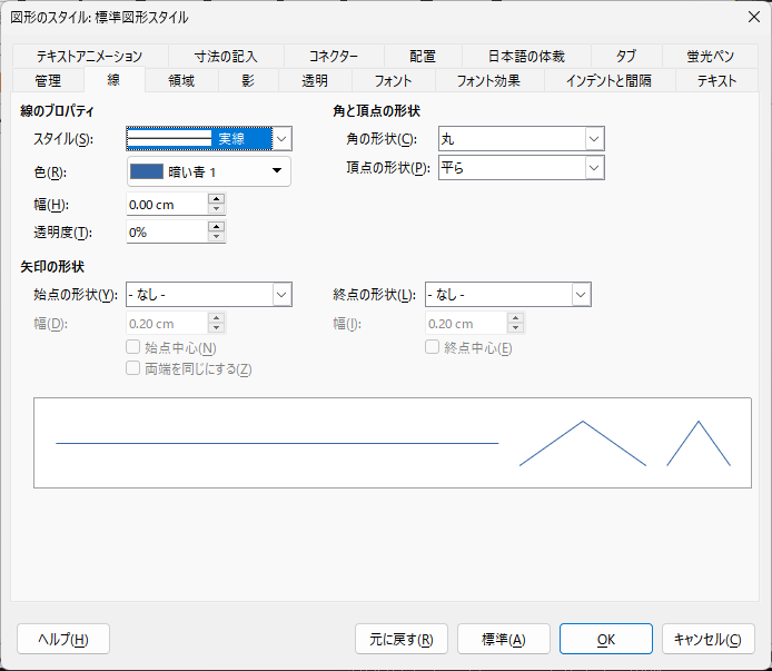 「線」タブで、線のデフォルトのプロパティを変更できます。