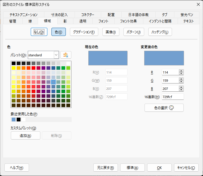 「領域」タブで、図形の塗りつぶし等のプロパティを変更できます。