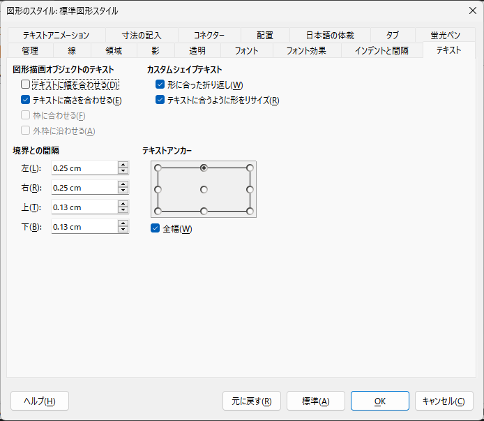他の図形の大きさとのバランスで、図形はそのままで、テキストは、はみ出てもいいから、折り返さないようにしたい時があります。
