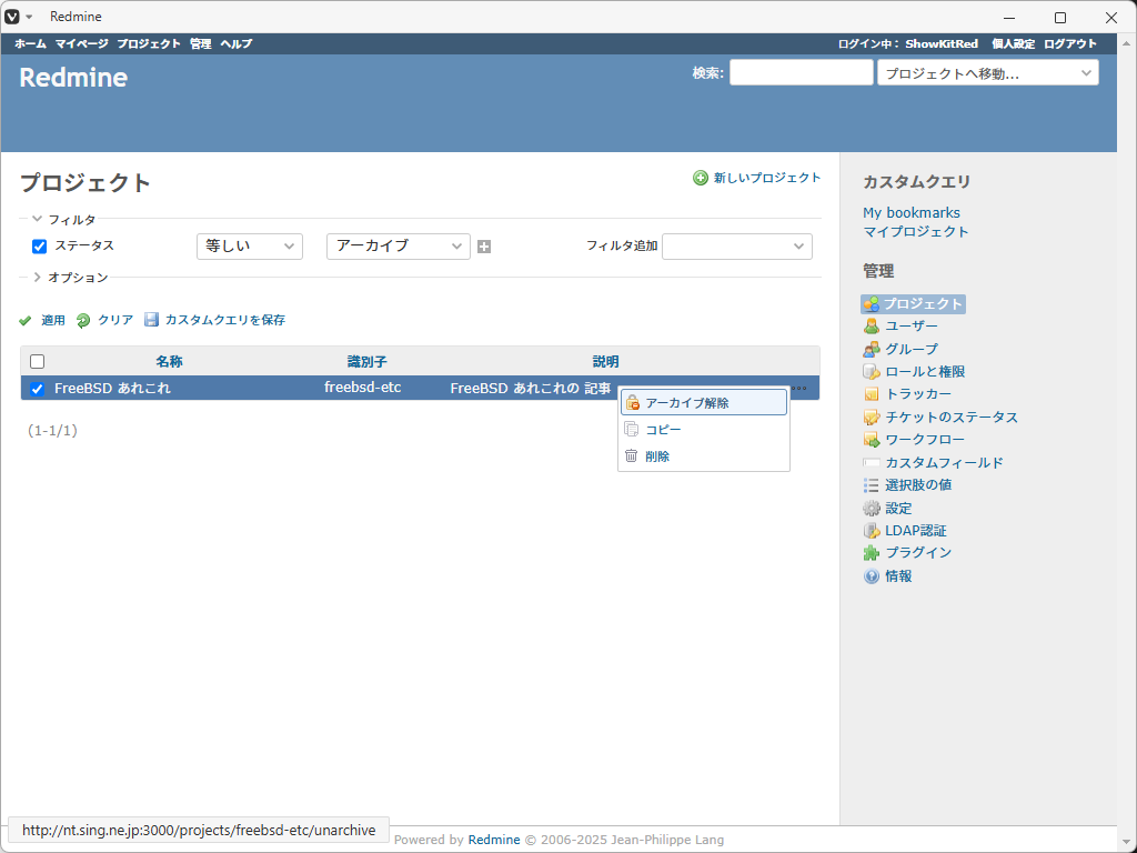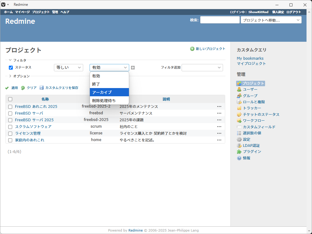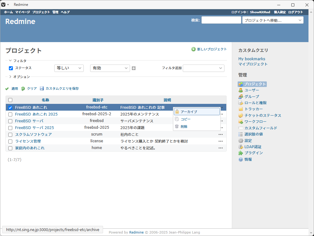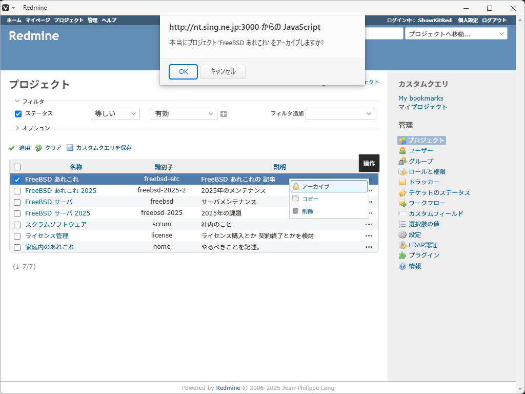 一覧で、アーカイブ化したいプロジェクトの右。 「...」→「アーカイブ」 「OK」 アーカイブ化したプロジェクトは、デフォルトの一覧から消えてしまいます。 表示されます。 一覧で、アーカイブ化を解除したいプロジェクトの右。 「...」→「アーカイブ解除」 表示していたものが消えて、有効なプロジェクトの一覧へ表示されるようになります。 |