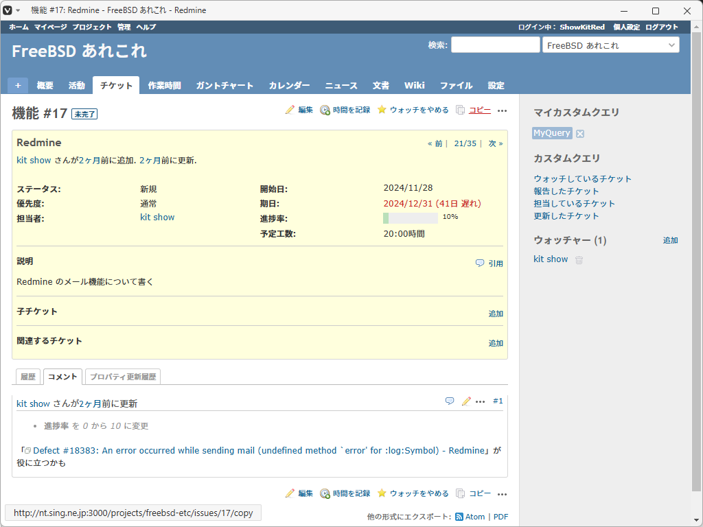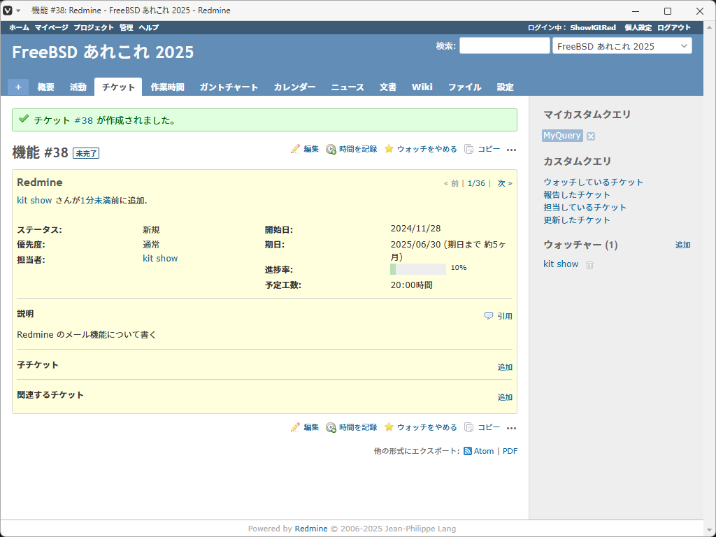 新しいチケットが作成されますので、所属プロジェクトを変更して。