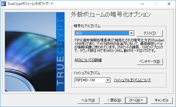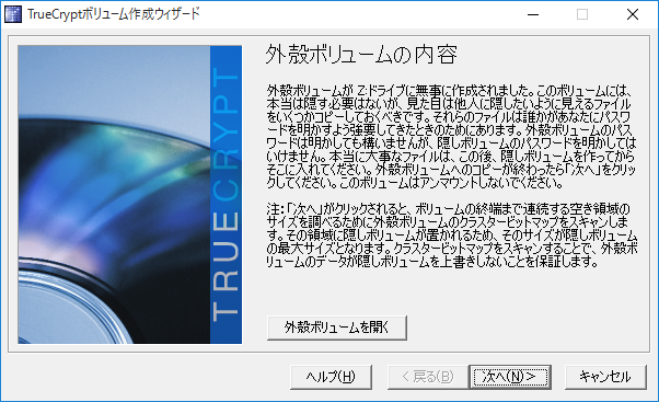 「TrueCrypt 隠しボリューム」にチェックをいれて「次へ」