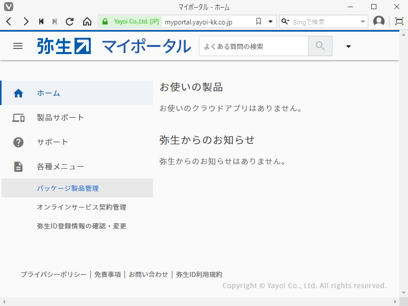 ブラウザが開いて、弥生のサイトが開きます。