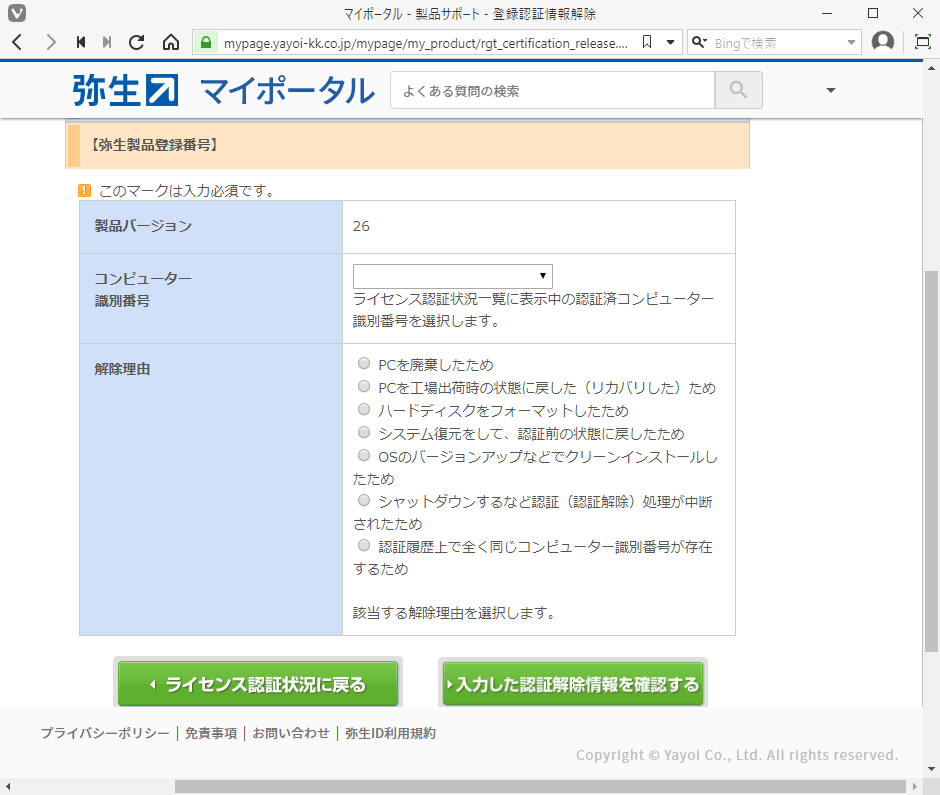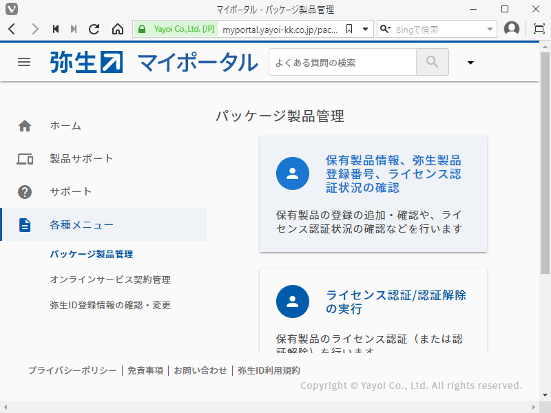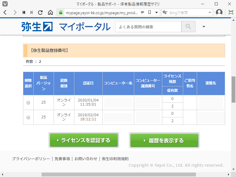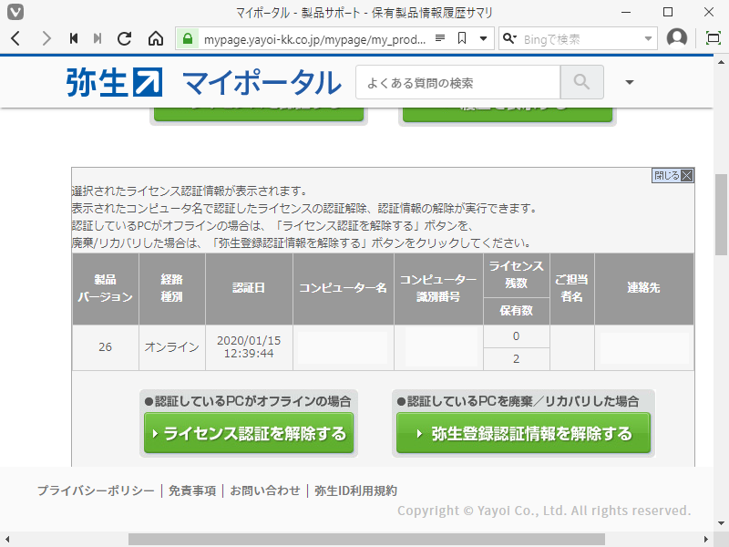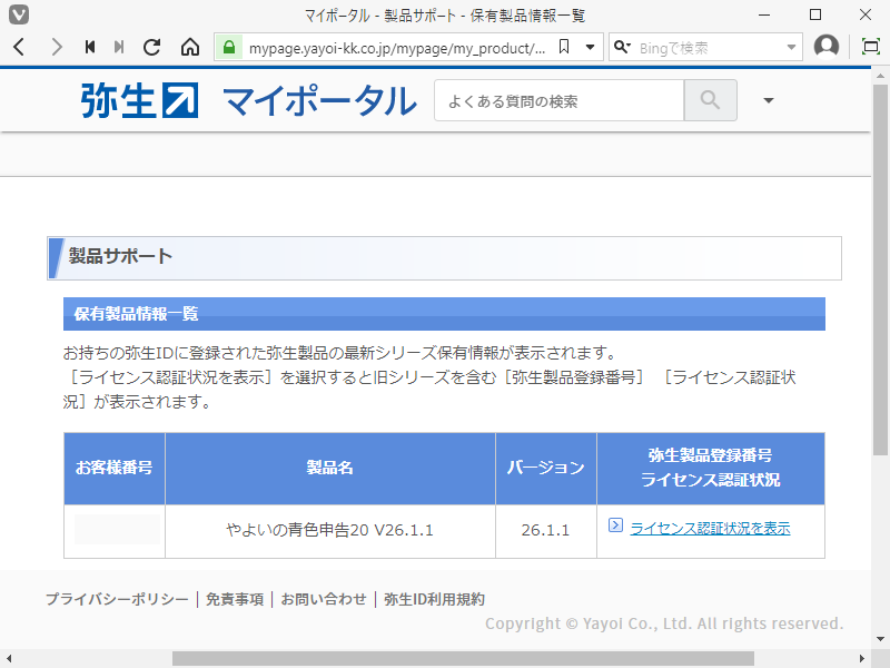 「保有製品情報、弥生製品登録番号、ライセンス認証状況の確認」