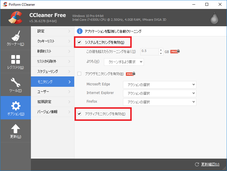 「システムモニタリングを有効」と「アクティブモニタリングを有効」のチェックをはずします。