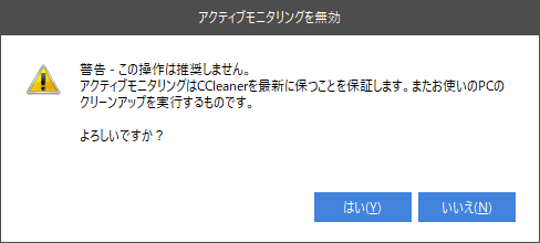 「アクティブモニタリングを有効」のチェックをはずすときに警告のダイアログが表示されますが