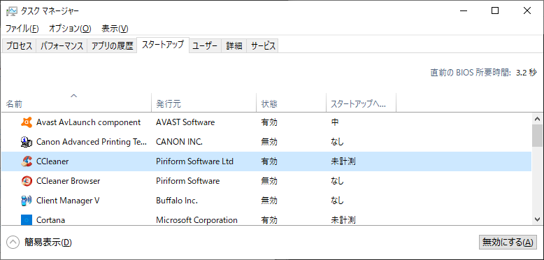 「CCleaner」を選択して「無効にする」でログイン時に起動しないようにします。