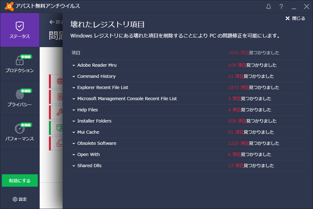 「Avast Free Antivirus」 のスマートスキャンで検出したパフォーマンスの問題というのに「壊れたレジストリ項目」というのがありまして