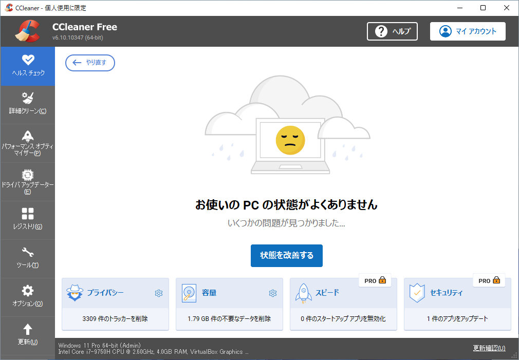 これ、「VirtualBox」上の「Windows11」で無償版を動かしているんですが、後半のオレンジの部分が、有償版になることがわかりますね。