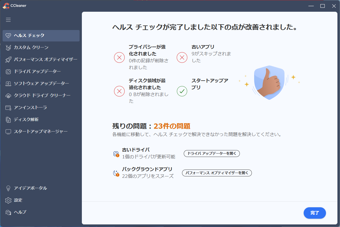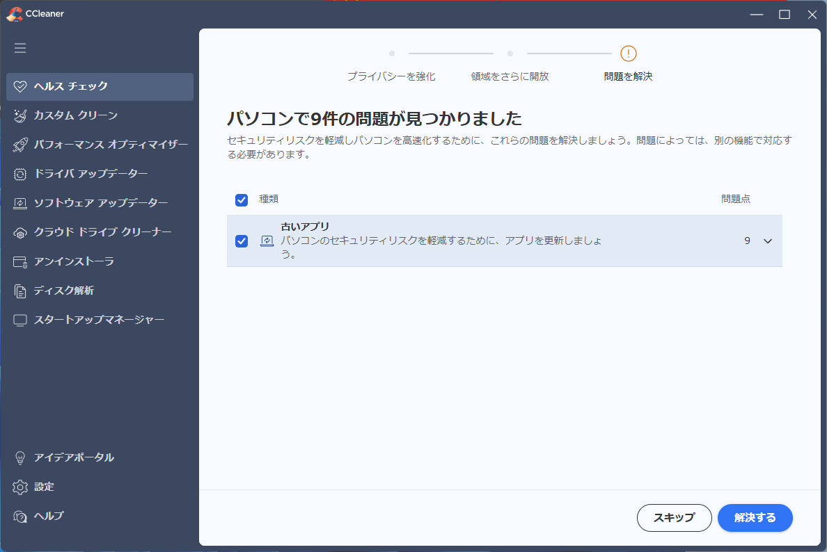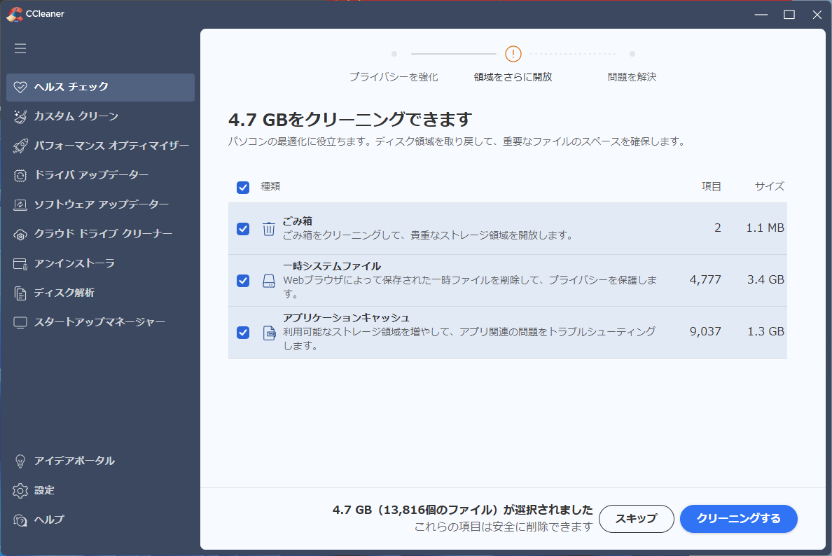 起動して、すぐは「ヘルスチェック」タブにいるはずです。