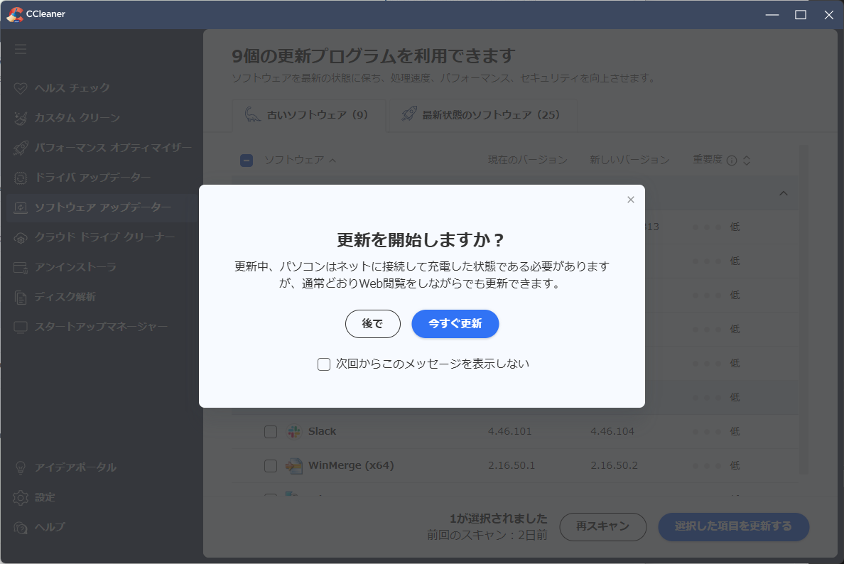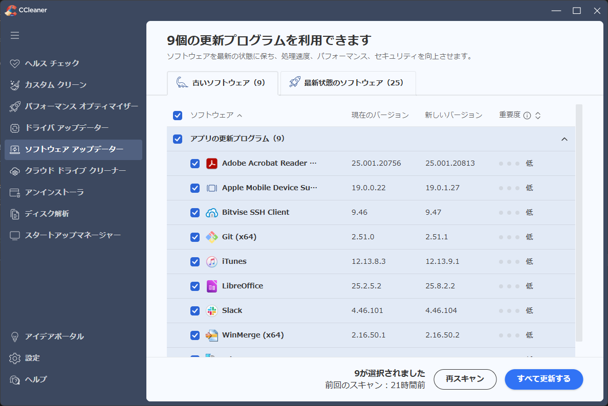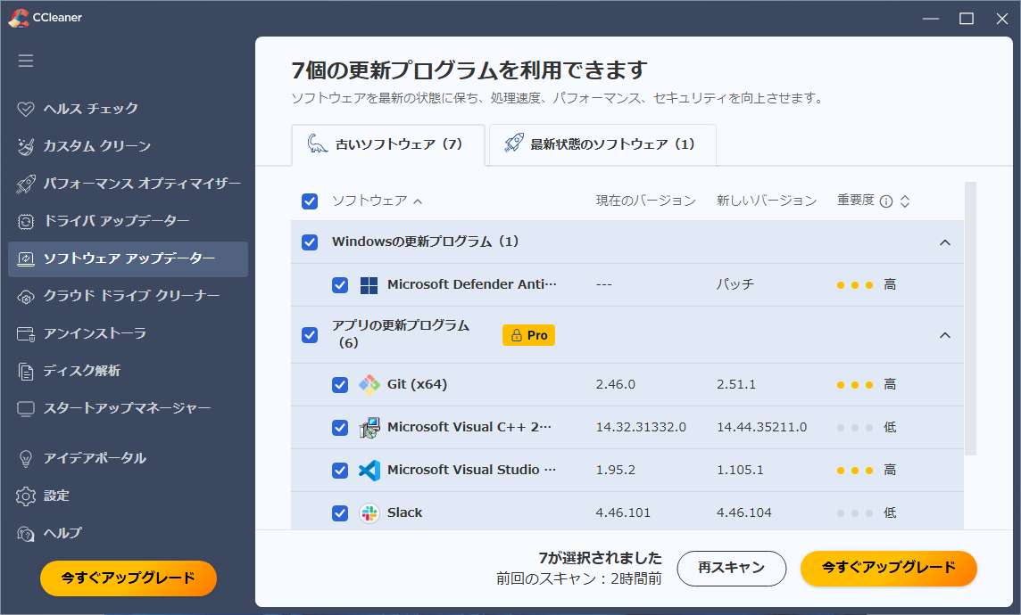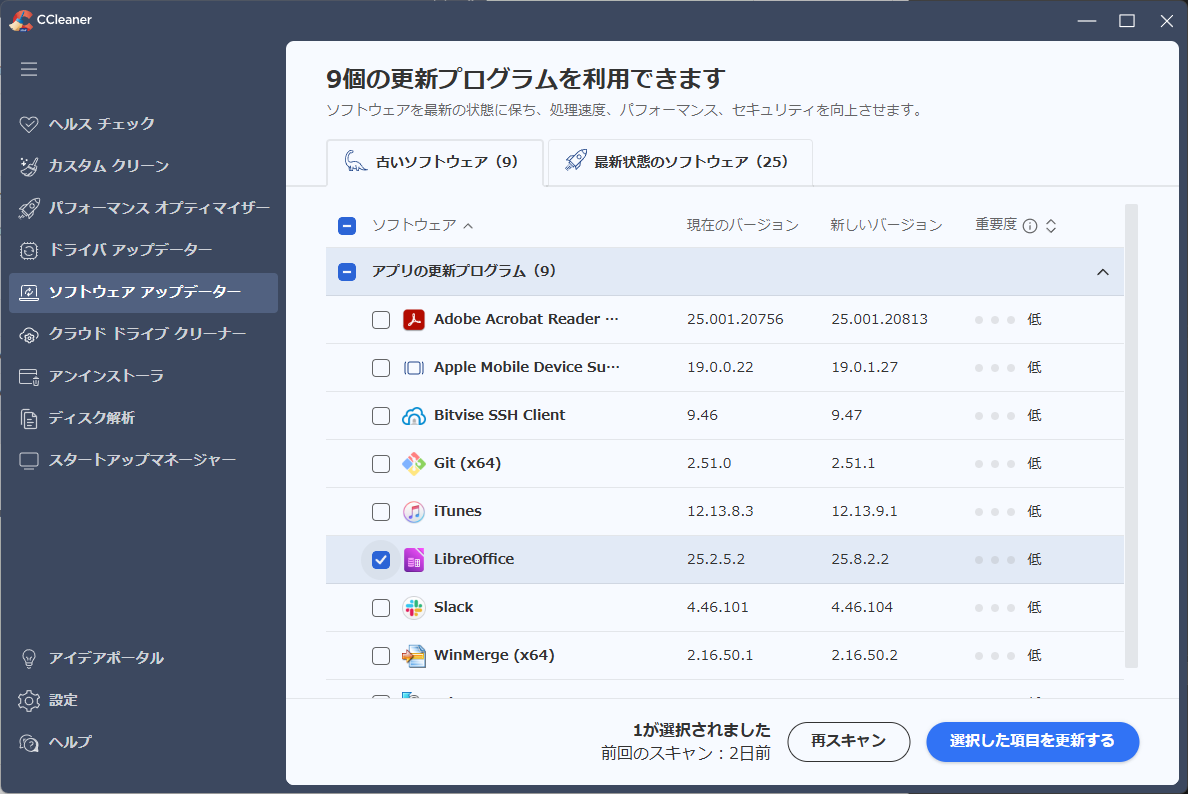 「ソフトウェアアップデータ」タブで、「スキャン」するとチェックが走ります。