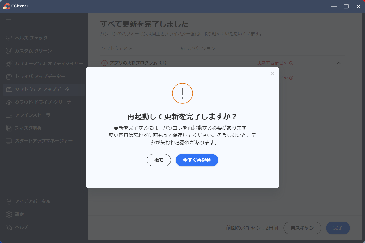 再起動するなり、「後で」にするなり、そこは、好きなように・・・。