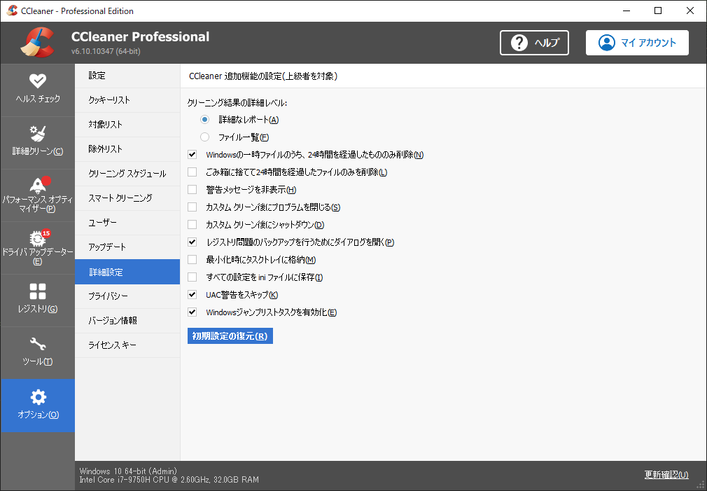 1. 概要 わたしみたいに、あっちゃこっちゃいじくりまわす人でないと、使う機能じゃないかと思いきや。 「FAQ」にあったので、結構使う人がいるのかもしれない。 「HELP」画面が英語なので、わたしみたいに馬鹿だとつらいですね。 2. デフォルトの設定に戻す バージョン「6.10.10347」であれば 「オプション」「詳細設定」で「初期設定の復元」
