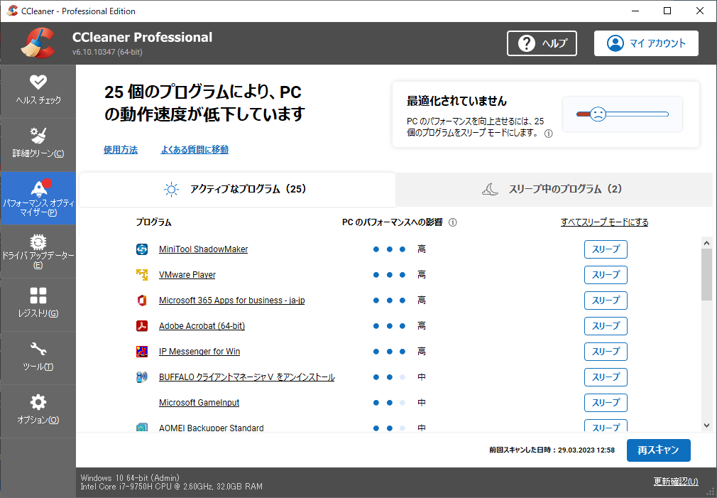 どうも、「CCleaner」でスリーブ設定していると、時間が経つと、死んだ鳥になるようです。