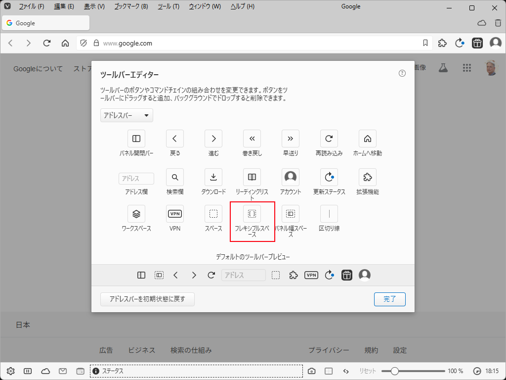 わたしには、長すぎて気持ちが悪い。 3. 設定 「ツールバーのカスタマイズ」で。 「フレキシブルスペース」ってのをアドレス欄の右に置いてやると。