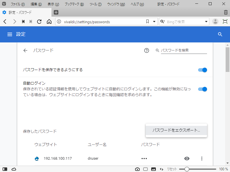 たどり着くのは「vivaldi://settings/passwords」なのですが、最初からこれを入力すると、「Vivaldi」の設定画面へたどり着いてしまいます。