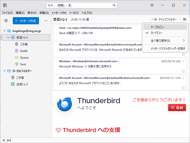 Thunderbird - 表示設定 - スレッドペイン カードビュー
