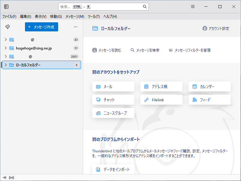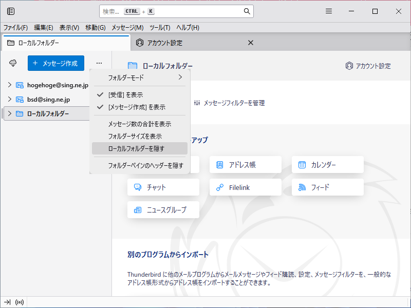 「Thunderbird 128.10.2esr」では、「ローカルフォルダ」を非表示にできます。