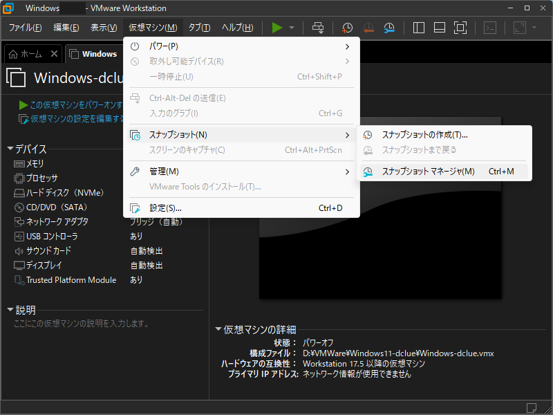 「仮想マシン」→「スナップショット」→「スナップショットマネージャ」
