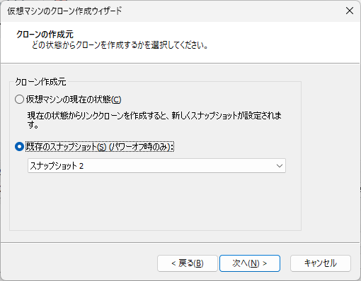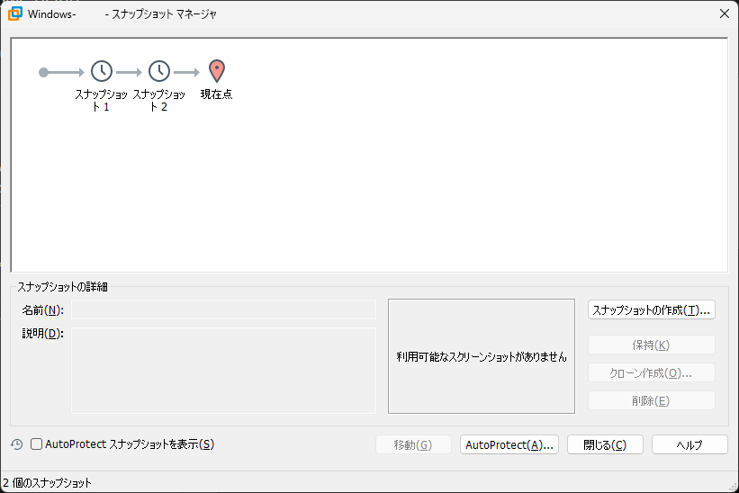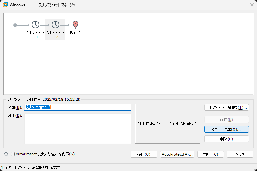 「スナップショット1」の状態に戻すと、「スナップショット2」は、消えてしまうようです。
