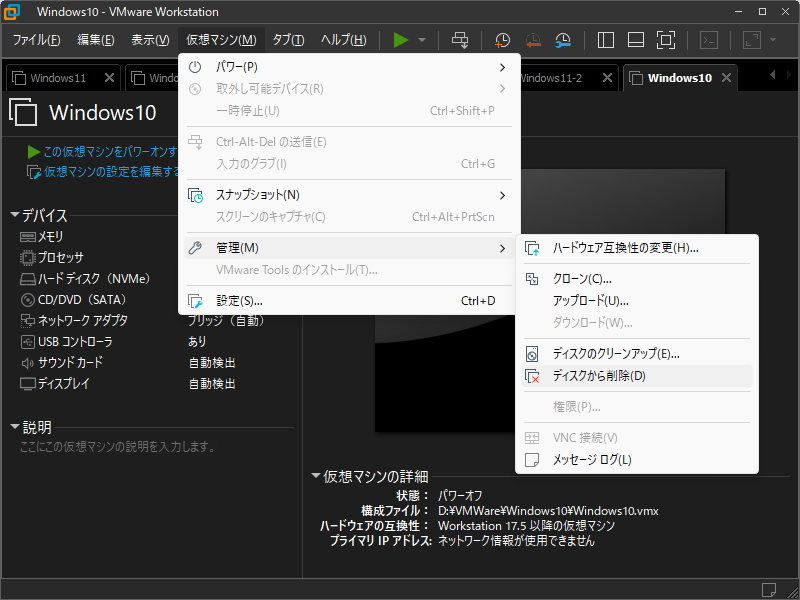 1. 概要 ホスト上から、仮想マシンを削除する方法について記述します。 以下、「VMware(R) Workstation 17 Pro」「17.6.3 build-24583834」での操作です。 2. 削除 仮想マシンのタブを選択して。 「仮想マシン」→「管理」→「ディスクから削除」
