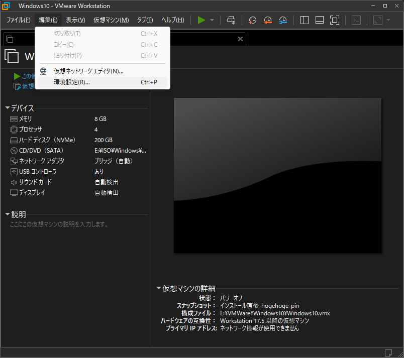 以下、「VMware(R) Workstation 17 Pro」「17.6.3 build-24583834」での操作です。