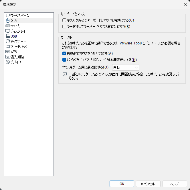 が、「VMWare Tools」をインストールしているゲストであれば、ゲスト上のどこかをクリックすれば、ゲストの入力が有効になっていたはずなのに。