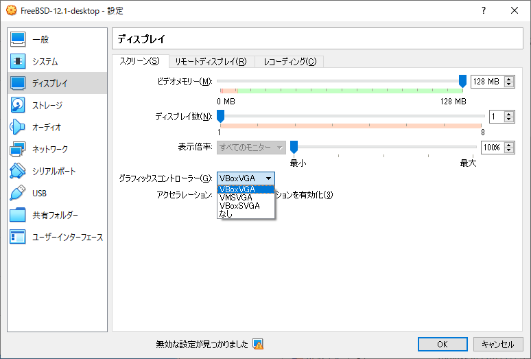 「VirtualBox 6.1」に至っては、「VBoxSVGA」以外は、無効な設定と言われてしまいます。