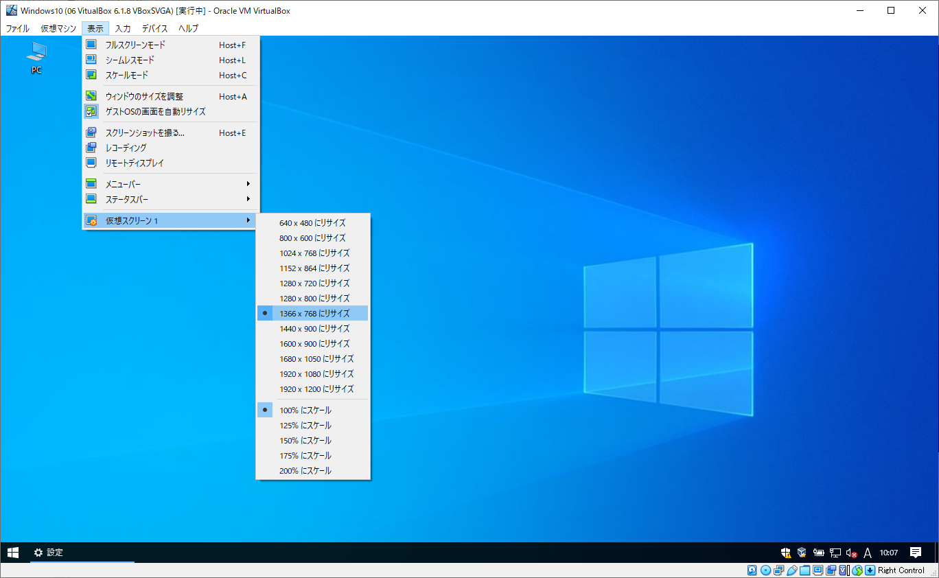 多くは「VBoxVGA」を設定していないと下記のように、「仮想スクリーン」をリサイズすることができません。