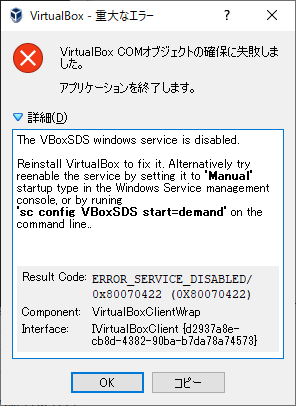 VirtualBox - トラブルシュート - VirtualBox.COM オブジェクトの確保に失敗しました
