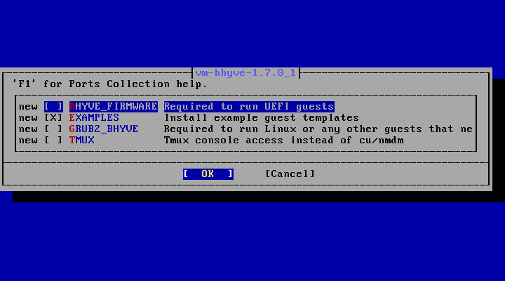 「Linux」を使う予定があれば、「BHYVE_FIRMWARE」「GRUB2_BHYVE」は、チェックをいれていれておくべし・・・。