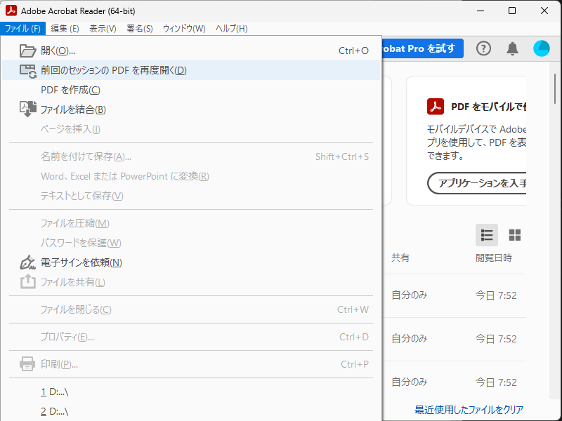 Adobe Acrobat Reader - 前回と同じファイルを開く
