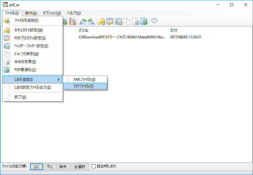 「pdf_as」を起動して、目次をつけるファイルを読み込んで。
